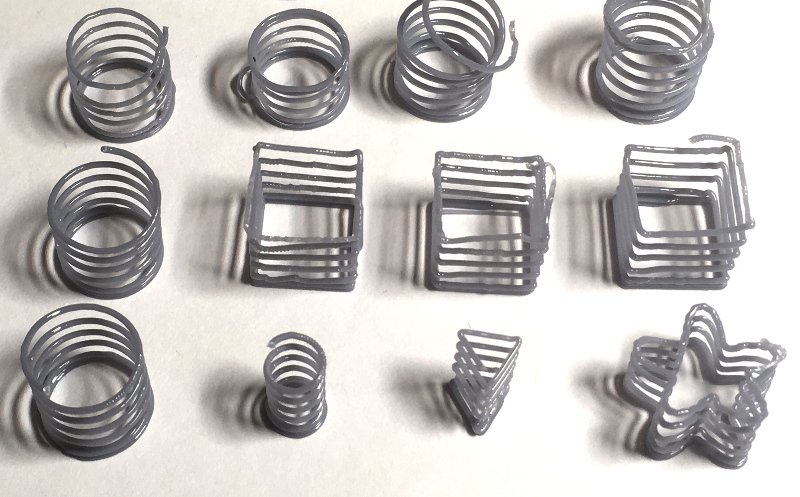 To give a sense for the time scale, each of the springs shown above took between 3-7 minutes to print (the first few layers are quick, then the midair coils move much more slowly).